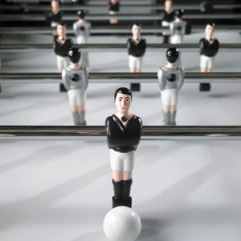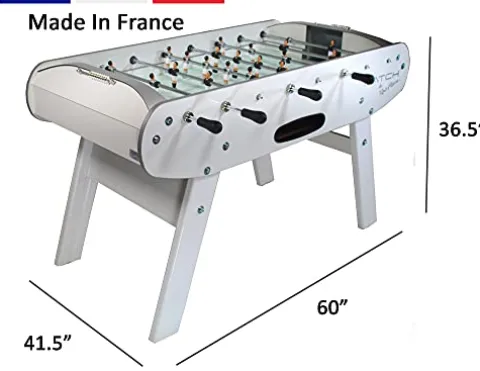 Experience the thrill of competitive foosball with the Rene Pierre Match Blanc Foosball Table Made in France. This top-of-the-line table features sloped corners in the playfield to keep the ball in play, telescopic playing rods with ergonomic handles for player safety and comfort, and solid diecast aluminum players that are hand-painted for a realistic look. Leg levelers are included to ensure a level playing field. Made in France, this foosball table combines expert craftsmanship with innovative design for an exceptional gaming experience.