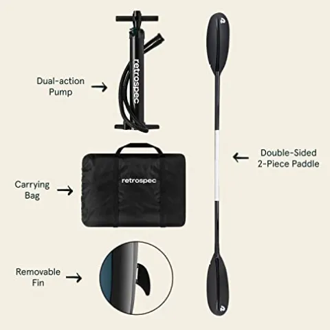 Experience the freedom of the water with the Retrospec Coaster 1 Person Inflatable Kayak in Ocean Blue. Designed for solo adventures, this lightweight kayak is constructed with heavy-duty 600-denier ripstop polyester for durability and stability on the water. With quick setup and easy portability, the Coaster includes front bungee straps for gear storage, a double-sided paddle, hand pump, removable fin, and a convenient carrying bag. Unleash your inner explorer and take on new aquatic escapades with this all-inclusive inflatable kayak from Retrospec.