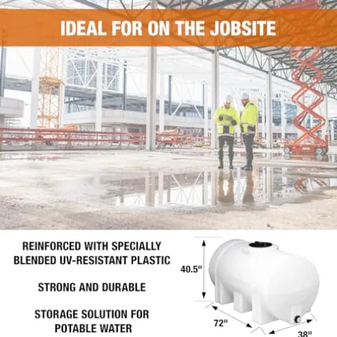 The RomoTech 82124259 Horizontal Polyethylene Reservoir Water Tank is a robust storage solution designed for water and non-flammable liquids, featuring an impressive 325-gallon capacity. Crafted in the USA from thick-walled, heavy-duty polyethylene, this rust and corrosion-proof tank ensures durability and long-term use. Its translucent material allows for easy visibility of contents, while molded-in graduation marks in gallons and liters facilitate accurate measurements. The tank also includes molded-in channels for saddle straps, ensuring secure transportation and stability. With a sleek saddle color, this reservoir combines functionality with reliability, making it an ideal choice for various applications.