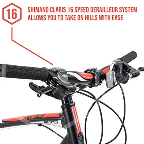 - 27.5” x 1.95” All-Terrain tires; switch from the road to the trail seamlessly; Shimano Claris rear derailleur provides you with 16 speeds to best suit your riding style; kickstand not included