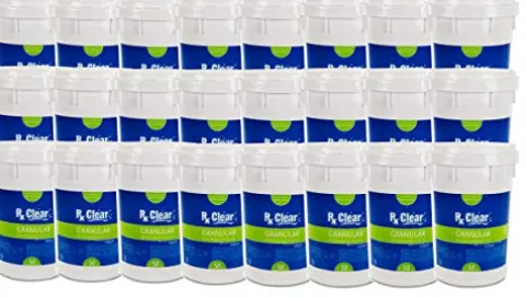 Maintain a safe and inviting swimming environment with Rx Clear Stabilized Granular Chlorine. This bulk package includes twenty-four 50-pound buckets, totaling 1200 lbs of chlorine that serves as a potent bactericide, algaecide, and disinfectant for pools and spas. The 99% sodium dichlor formula ensures crystal clear water without harsh effects on your skin. With UV protection and fast-dissolving properties, this chlorine lasts longer than other options, requiring fewer chemical adjustments. Trust Rx Clear for top-quality pool maintenance supplies that keep your water pristine and inviting.