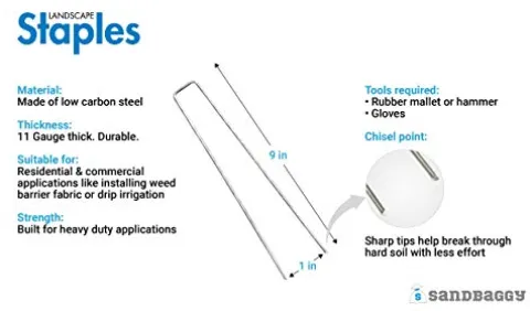- EXTRA LONG 9 INCH LANDSCAPE STAPLES FOR SOFT SOIL: If you have soft sandy soil, don’t use standard 6 inch staples! They won’t hold in the ground. Use Sandbaggy 9 inch staples instead – that additional 3 inches of strong 11 gauge steel will keep your staple in place!