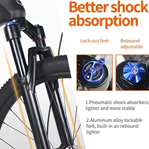 - 【Hydraulic Suspension Fork】 This suspension fork with lockout delivers 100mm of suspension travel and an excellent damping system no matter where you ride. It allows you to choose whether you need suspension function according to your riding environment.One-piece oil disc brakes, sensitive brakes, porous design of brake pads, conducive to heat dissipation and braking.