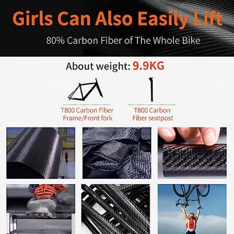 - 【T800 Carbon Lightweight Bikes】:Gravel Road Bike with T800 carbon fiber frame,carbon front fork and carbon seat tube. Weight only 10.2kg (22.4 lb). Under the same volume, the hardness of the material is 5 times higher than that of the aluminum alloy bicycle frame.Lightweight design for this adult bike is suitable for men and women.The first choice for beginner , advanced and enthusiast riders.
