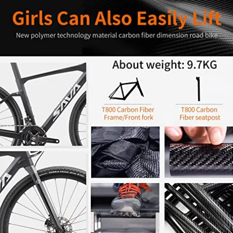 - 【T800 Carbon Lightweight Bikes】:Gravel Road Bike with T800 carbon fiber frame,carbon front fork and carbon seat tube. Weight only 10.2kg (22.4 lb). Under the same volume, the hardness of the material is 5 times higher than that of the aluminum alloy bicycle frame.Lightweight design for this adult bike is suitable for men and women.The first choice for beginner , advanced and enthusiast riders.