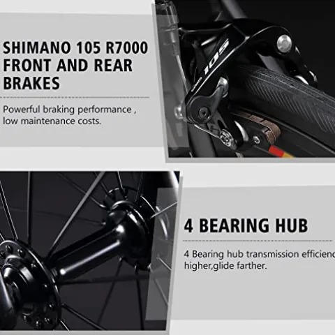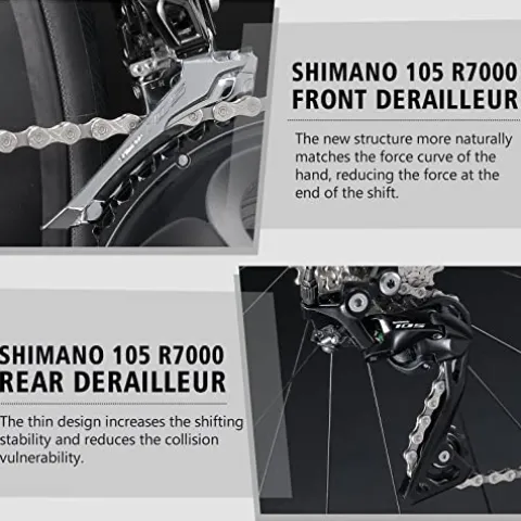 - 【Efficient Transmission System】:SHIMANO 105 drivetrain groupset provides 2*11 speeds with Shifter lever, Front derailleur, Rear derailleur, V Brake, and Crankset. It can provide lightning-fast shifting and a level of responsiveness that can’t be matched.