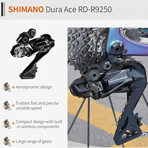 - 🚴【SHIMANO DURA ACE Di2 GROUPSET】- SAVADECK electronic shifting road bike with DURA ACE Di2 R9270 groupset 2*12 speed disc brake, ST-9270 dual shifting levers, FC-R9200 crankset, FD-9250 front derailleur and RD-9250 rear derailleur, small Di2 mechanism units precisely control the movement of each derailleur, the powerful lightweight motor provides flawless performance in all conditions and on all terrains.