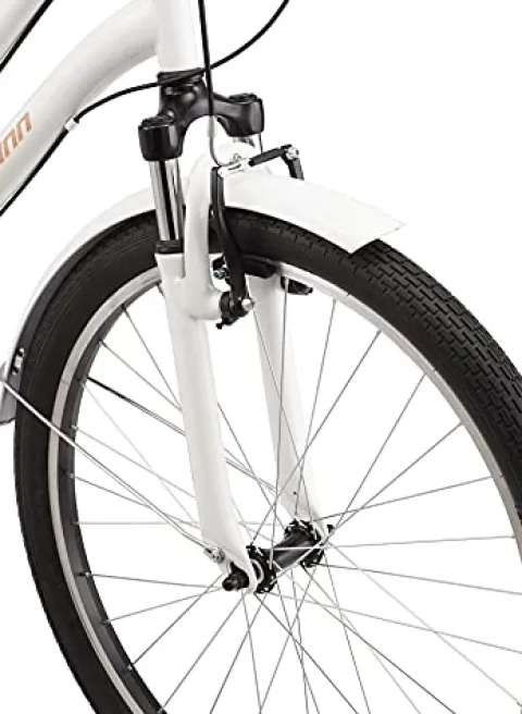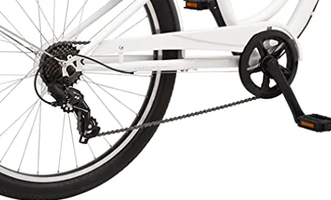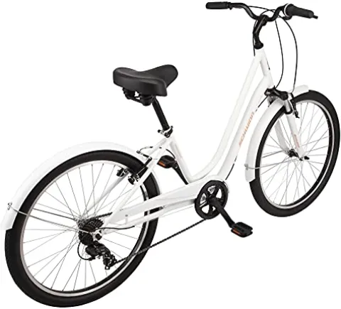 Experience the ultimate comfort and style with the Schwinn Regioneer Women’s Hybrid Comfort Bike. Designed with a sturdy RPG steel frame and suspension fork, this bike offers an upright riding position ideal for leisurely neighborhood rides. The Shimano 7-speed Revo shifter and derailleur ensure smooth gear transitions, while the front and rear alloy linear pull brakes provide reliable stopping power. Lightweight alloy rims and 2.125-inch comfort tires contribute to a smooth and comfortable ride. With its sleek white color and top-notch features, this Schwinn bike is a perfect blend of performance and aesthetics.