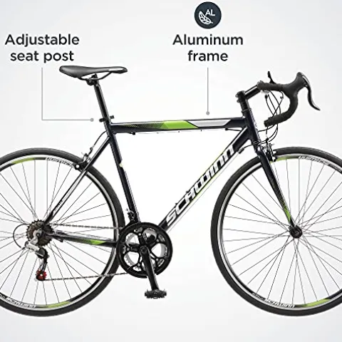 The Schwinn Volare 1300 Drop Style Hybrid Sports Road Bike offers a quick and agile riding experience with its 21-inch aluminum fitness frame and rigid fork, perfectly complemented by 700c wheels suitable for riders between 5’4″ to 6’2″ in height. Its Shimano 14-speed A050 shifters and rear derailleur ensure swift and seamless gear changes, while the alloy crank with double chain rings provides optimal gearing for a smooth ride. This road bike features alloy caliper brakes for superior braking performance and a drop style handlebar with a sport saddle for added comfort. With high profile double-wall alloy rims for durability, this hybrid bike comes partially assembled and requires basic tools for completion.