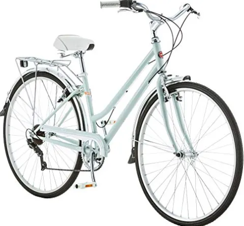 The Schwinn Wayfarer Adult Hybrid Bike in Light Mint is an ideal choice for urban commutes or leisurely rides. Designed with a durable 16-inch steel frame and steel fork in a retro city-style, this bike offers both strength and agility. The 7-speed drivetrain ensures seamless gear transitions, while the rear cargo rack provides ample storage for your essentials. With front and rear alloy linear pull brakes, you can enjoy quick and efficient stopping power. The swept-back handlebars promote a comfortable and ergonomic riding position, reducing strain on your back. Perfect for riders 5’4″ to 6’2″ tall, this bike with 700c wheels is a versatile option for both men and women.