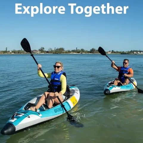 Experience unparalleled convenience and performance with the Sea Eagle EZLITE 10 Kayak. Designed with all woven drop stitch construction, this ultralight kayak offers remarkable rigidity and stability, ideal for both seasoned paddlers and beginners. The V-bottom design ensures smooth, fast paddling and enhanced tracking, while the removable skeg boosts performance on the water. Weighing just 26 lbs., it effortlessly transitions from backpack to water in under 4 minutes, thanks to its simple two-compartment inflation system. Available in a striking white, turquoise blue, and yellow color scheme, the EZLITE 10 comes complete with a 4-part 8′ paddle, adjustable footrests with 20 positions, a seat, and a convenient backpack. With a 3-year manufacturer’s warranty, this kayak promises reliability and adventure in every journey.