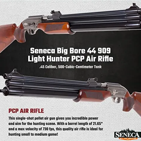 The Seneca Big Bore 44 909 Light Hunter PCP Air Rifle delivers unmatched power and precision for serious hunters. Chambered in .45 caliber, this single-shot air rifle features a 21.65″ barrel capable of reaching velocities up to 730 fps, making it perfect for targeting small to medium game. Its user-friendly bolt-action mechanism, combined with dual air chambers totaling 500 cc and a max-fill pressure of 3,000 psi, ensures reliability and versatility in the field. Crafted with a striking hardwood Monte Carlo stock and enhanced with a rifled barrel, the rifle is designed for both comfort and accuracy. Safety is paramount with a manual safety feature and a quick-disconnect Foster fitting, providing a secure and enjoyable shooting experience. Equip yourself with the Seneca Big Bore 44 909 and elevate your hunting adventures.