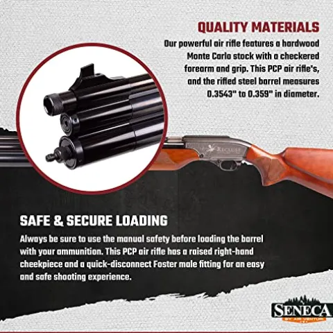 - QUALITY MATERIALS: Our precharged pneumatic rifle features a hardwood Monte Carlo stock with a checkered forearm and grip. This PCP rifle has a rifled barrel that measures 0.4516″ to 0.4567″ in diameter.