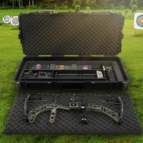 The SKB iSeries Compact Ultimate Hard Exterior Waterproof Bow Case is expertly designed for the serious hunter, accommodating two bows—one up to 42 inches and the other up to 40 inches—while providing superior protection with its rigid bunk-bed padding. The interior features a spacious accessory tray that securely holds up to 11 arrows, ensuring all your gear is organized and accessible. Engineered with a waterproof and dust-tight design, this case also includes cushion grip handles and in-line skate wheels for effortless transport. For added peace of mind, the Trigger Latch System can be upgraded with TSA-approved locks, while stainless steel padlock protector clips enhance security. With dimensions tailored for functionality and durability, this bow case is the ultimate companion for your hunting adventures.
