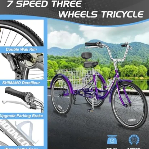 The Slsy Adult Tricycles 7 Speed are versatile three-wheeled bikes designed for seniors, women, and men looking for a comfortable and stable riding experience. Available in 20, 24, and 26-inch sizes to suit various rider heights, these trikes feature a sturdy steel construction that can support up to 350 lbs. The large rear basket adds convenience for shopping or carrying items while on the go. With a smooth ride on different road surfaces, these trikes offer both practicality and enjoyment for leisurely rides. Backed by a one-year warranty on defective parts and a 30-day money-back guarantee, Slsy ensures premium quality and customer satisfaction with every purchase.