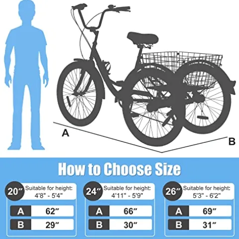 - ★Please Make Sure the Size Before Purchasing: 20″ wheel suitable for rider height: 4’8″ – 5’6″, 24″ wheel suitable for rider height: 4’11” – 5’10”, 26″ wheel suitable for rider height: 5’3″ – 6’2″. Slsy Adults Tricycles are equipped with user manual, assembly tool, water bottle cage.