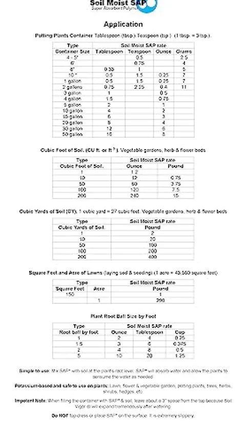 Commercial Agriculture Grade Potassium Polymer by Soil Moist SAP is an essential tool for enhancing soil health and plant growth. This powerful polymer absorbs up to 800 times its weight in water, significantly improving soil retention and reducing drought stress in plants. With a coverage of 150 sq. ft. per pound, it optimizes irrigation practices and increases the efficiency of fertilizers, promoting a slow release that minimizes runoff and environmental impact. Non-toxic and reusable for up to 7 years, this versatile solution influences soil permeability, density, and texture, ensuring your garden or lawn thrives with less water and effort. Transform your planting experience and maximize your yields with this innovative agricultural product.