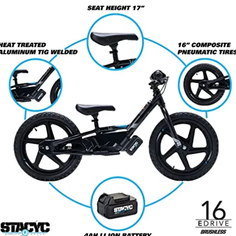 - Durable and reliable: Built with an aluminum TIG welded and heat-treated frame, 16″ composite wheels with pneumatic tires, and thermal protection for the motor and controller, the STACYC 16eDRIVE is designed to last.