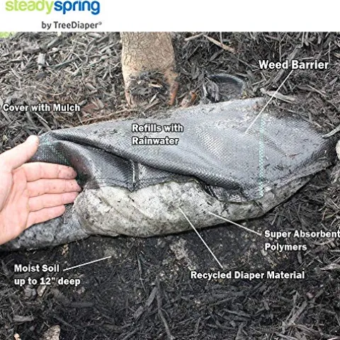 The SteadySpring® Smart 30+Day Tree Watering Mat is designed for optimal plant establishment, efficiently managing moisture for trees with root balls measuring 16 to 23 inches in diameter. This innovative watering solution uses 99% less water than traditional methods, ensuring your trees thrive while minimizing environmental impact. With a durability of 3-5 years, it self-refills with rain and snow, even in freezing conditions, and features a weed barrier to protect your plants from nutrient competition. Easy to use—simply soak, set, and forget—this mat stabilizes soil moisture, preventing both root rot and dehydration for healthy tree growth. Enhance your gardening experience with the SteadySpring Tree Mat, your reliable partner in nurturing flourishing trees.