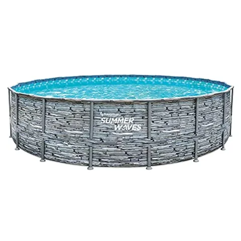 Enjoy the ultimate backyard oasis with the Summer Waves 18ft Elite Frame Above-Ground Pool in Stone Slate. This premium pool features durable oval frame tubes for added strength and a snap-in design for quick assembly. The stylish stone slate exterior and modern honeycomb interior prints elevate your outdoor space. Complete with a SkimmerPlus SFX1500 Filter Pump, ladder, pool cover, maintenance kit, and ground cloth, this set has everything you need for a refreshing swim all summer long. Plus, the filter pump conveniently attaches to the sidewall to prevent any tripping hazards, ensuring a safe and enjoyable swimming experience. Dive into relaxation with this top-of-the-line above-ground pool.