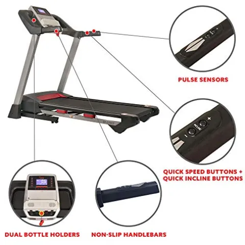 Enhance your home workout routine with the Sunny Health & Fitness Folding Treadmill in Gray. Designed for performance, this treadmill offers speeds up to 10 mph and 15 levels of automatic recline to intensify your cardio sessions. Track your fitness progress with 15 pre-installed workouts, 3 custom user entries, and onboard stats like time, speed, distance, heart rate, and calories burned. Stay entertained and connected with the USB and Bluetooth capabilities, allowing you to charge your devices and stream music through the built-in speakers. The spacious 19in x 52in running belt provides a comfortable workout area, while the handrail controls ensure stability and easy adjustment of speed and recline during your exercise.