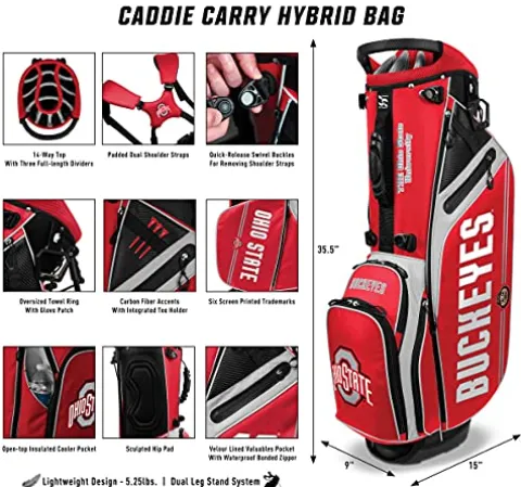 Carry your golf essentials in style with the Virginia Tech Hokies Caddie Carry Hybrid Golf Bag by Team Effort. This bag features a 14-way top with 3 full-length dividers to keep your clubs organized, along with quick-release swivel buckles for easy removal of the dual padded shoulder straps. The open-top insulated cooler pocket is perfect for keeping drinks cold on the course. Show off your team pride with screen printed team trademarks and carbon fiber accents, complete with an integrated tee holder. Additionally, the bag includes a velour-lined valuables pocket with a waterproof bonded zipper, an oversized towel ring with glove patch, and a sculpted hip pad for comfort during long rounds.