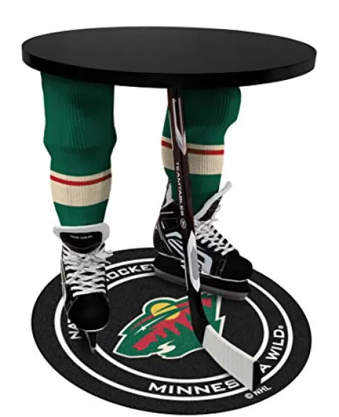 The Team Tables Minnesota Hockey Table in Black with Minnesota Puck Mat is a must-have for any sports enthusiast. Made in North America with premium materials, this table features a high-grade aluminum cast hockey stick, steel legs, real skates, and foam molded hockey legs wrapped in real socks, ensuring durability and All-Star quality. Perfect for the sports cave, kids room, office, or vacation home, this versatile table can be used as an end table, nightstand, accent table, or side table. With dimensions of 26″ H x 24″ D and weighing 32 lbs, assembly is quick and easy. Plus, the officially licensed Minnesota puck mat adds an extra touch of authenticity to this standout piece of sports memorabilia.