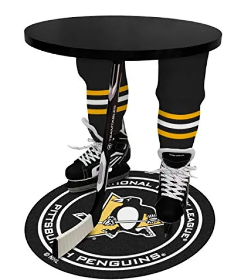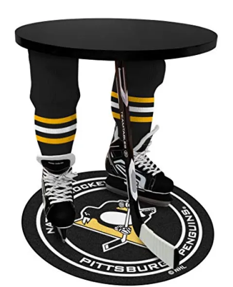 Elevate your sports room with the Team Tables Pittsburg Hockey Table featuring a sleek black table top adorned with the iconic Pittsburg Puck Mat. Proudly made in North America, this piece of sports memorabilia boasts premium materials including a high-grade aluminum cast hockey stick and sturdy steel legs for lasting durability. Perfect for any space from sports caves to kids’ rooms, this versatile table can serve as an end table, nightstand, accent table, or side table. Officially licensed, this table stands at 26″ high, 24″ deep, and weighs 32 lbs for easy placement and assembly. Make a statement with this All-Star quality hockey table that will impress sports fans of all ages.