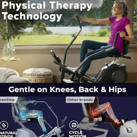 The Teeter FreeStep Recumbent Cross Trainer and Elliptical (LT3) by Teeter offers a zero-impact exercise solution suitable for all fitness levels. Its natural stepping motion and comfortable seated position provide a total body, fat-burning cardio workout while minimizing stress on joints and back, making it an excellent option for individuals with Arthritis, Parkinson’s, or MS. Featuring physical therapy technology with a patented natural stride, this home-use stepper delivers gentle yet effective exercise akin to what’s found in a PT office. With dual power motion engaging both upper and lower body, Whisper-Quiet Magnetic Resistance with 13 levels, adjustable handles and seat positions, and premium features like UltraGlide Bearings and a ComfortSelect Seat, the Teeter FreeStep LT3 ensures a smooth, customizable, and quiet workout experience.