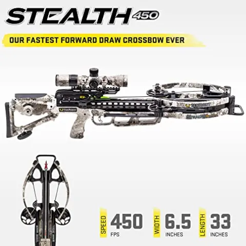 - MORE SPEED, MORE ACCURACY, MORE MOBILITY – Our fastest forward draw crossbow ever, the Stealth 450 shoots 450 feet-per-second and measures a narrow 6.5 inches wide—giving you more speed & more mobility to make you a more successful hunter.