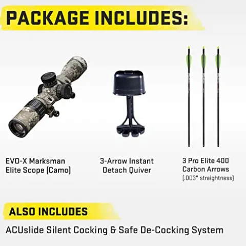 - WHAT’S INCLUDED – This crossbow comes with our ACUslide cocking and de-cocking system, an EVO-X Marksman Elite Scope, 3 Pro Elite 400 Carbon Crossbow Arrows, a Bubble Level, an Integrated String Stop System, a Quiver, and a Sentry Bowhanger.