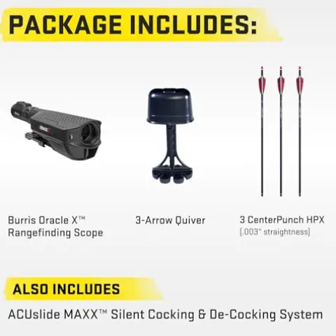 - WHAT’S INCLUDED – This bow comes with the Burris Oracle X Rangefinding Scope, ACUslide MAXX, three CenterPunch HPX Carbon Arrows, an integrated string stop, a bow hook, and a quiver.