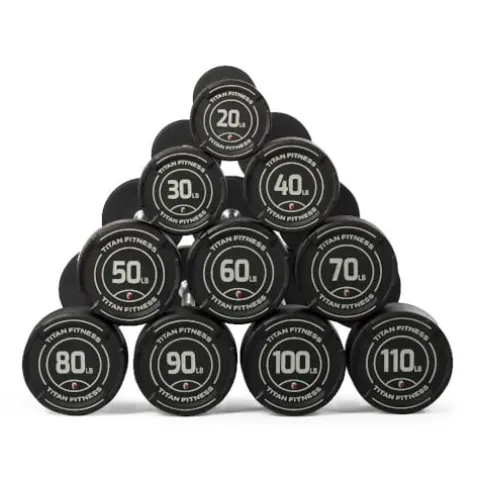 Enhance your weightlifting routine with the Titan Fitness Rubber Straight Fixed Barbells, available in weights ranging from 20 LB to 110 LB. Designed for individuals of all fitness levels, these barbells feature dual knurled grips for a secure hold and comfortable feel during workouts. Crafted from durable cold-rolled steel with a hard-chrome finish, these barbells are ideal for various exercises like bench presses and deadlifts. The pre-loaded rubber weights at each end ensure durability and protection for your gym floor. With different sizes available, these fixed barbells are versatile and reliable tools for strength training and weightlifting sessions.