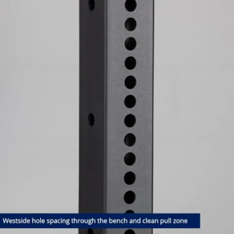- X-3 SERIES BOLT DOWN POWER RACK: Available in 80 or 90-inch models, comes standard with (4) laser-cut steel uprights with Westside hole spacing through the bench and clean pull zone, 2-inch spacing above and below, 6-inch side hole spacing throughout entire upright, and (4) steel side bracings for optimal stability.