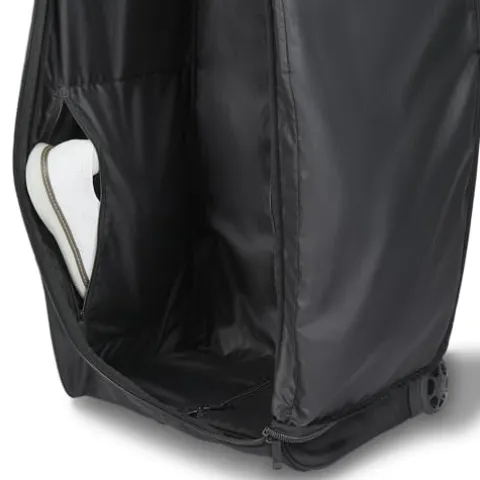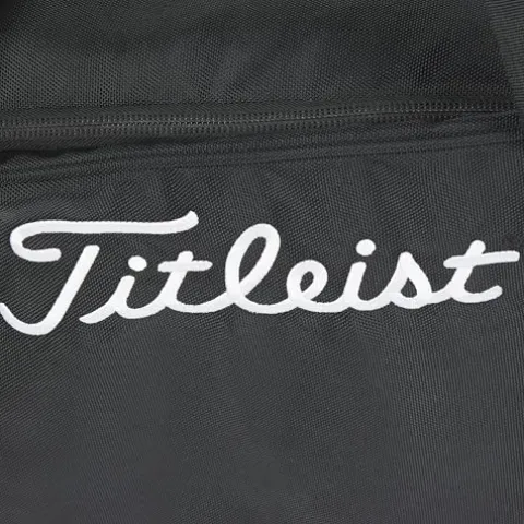 Transport your golf gear with ease and style using the Titleist Players Travel Cover in sleek black. This travel cover features a new U-shaped opening for effortless loading and unloading, along with two interior shoe pockets to keep your footwear organized. With interior straps to secure your golf bag in place and durable skate wheels for smooth mobility, this cover offers both convenience and protection for your equipment. Additionally, the external valuables pocket provides a handy storage space for your personal items. Travel confidently knowing your gear is safe and secure in this top-quality Titleist travel cover.
