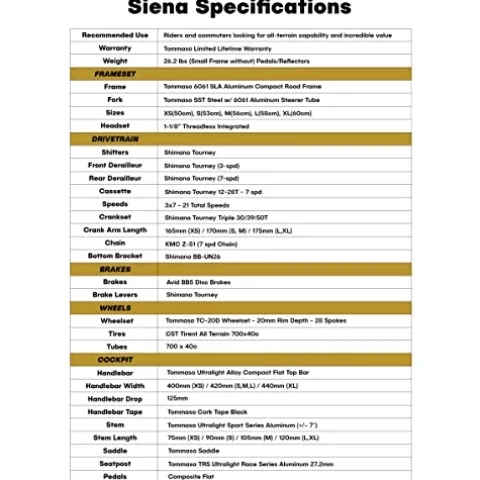Experience the thrill of off-road adventures with the Tommaso Siena Sport Performance Aluminum Gravel Bike. Designed for riders serious about their cycling goals, this top-performing bike is equipped with high-quality components typically found on higher-end models. Conquer any terrain with unwavering stability and versatility, thanks to the 700x40c tires and TC-20D rims. The Shimano Tourney shifters provide consistent, reliable shifting, allowing you to focus on pushing yourself to new limits. Built with premium aluminum and backed by a lifetime warranty, this bike is a reliable companion for all your cycling endeavors. Please note that professional assembly is required for safety and optimal performance.