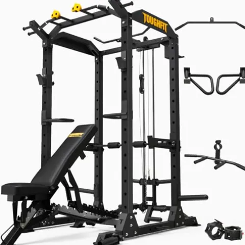 The ToughFit 2024 Upgraded T2 Power Cage T2BLK-WB is a top-of-the-line home gym essential that offers a premium light commercial power cage experience. Made from high-quality Q235 carbon steel, this power cage is built to last with sturdy welded steel pipes and an environmentally friendly powder coating. The 2024 updated design includes customizable climbing blocks and a versatile T bar handle for a personalized workout experience. With a maximum weight capacity of 1000 lbs and a variety of attachments including a lat pulldown system and adjustable weight bench, this power cage is perfect for serious strength training enthusiasts. Plus, with 18 included accessories and ample storage options, you’ll have everything you need for a comprehensive home workout setup.