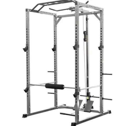 The Valor Fitness BD-41 Heavy Duty Power Rack with Multi-Grip Chin-Up Bar & LAT Pull Attachment is a robust and versatile addition to your home gym setup. Constructed from 2.5” x 2.5” 12-gauge steel with rubber base caps for stability and floor protection, this power rack includes J-Hooks with rugged padding for safely racking Olympic bars. The added LAT pull attachment with a standard black 38” lat pull bar and 20” accessory pull down bar, along with an adjustable accessory chain, offers a variety of workout options. With a 500 lb. max load outside the cage and 650 lb. max load inside, as well as a 200 lb. max load on the Lat Pull, this power rack ensures durability and safety during your strength training sessions.