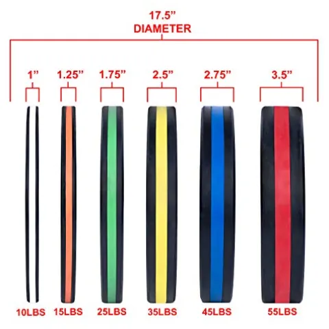 - COLOR CODED WEIGHTS- Each bumper plate has a colored centered disc and stripe around the plate for easy weight identification during workouts and between sets, allowing a more efficient workout without scrambling for the right weights. Meant for any gym space.