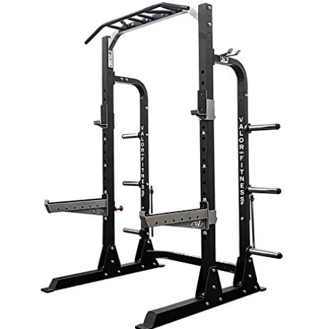 The Valor Fitness Half Rack Squat Machine offers a heavy-duty and versatile workout solution for your home or light-commercial gym. Made from 3″ x 3″, 11-gauge steel, this squat rack is rated for 750 lbs and features a floor mount base for added stability. The multi-grip pull up station with adjustable height and 5 positions allows for various upper body exercises, while the 23″ safety bars enable safe squat workouts. With Olympic barbell and plate storage, along with resistance band pegs, this power rack keeps your space organized. Compatible with optional accessories like a dip attachment and weightlifting platform, this squat machine is a must-have for serious strength training enthusiasts.
