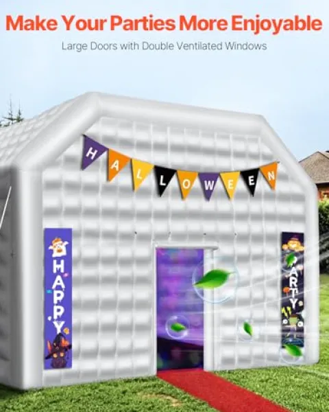 The VEVOR Inflatable Nightclub offers a spacious 581 sq ft (54 m²) environment, perfect for hosting unforgettable events such as birthday parties, weddings, and family gatherings. With a powerful 1100W blower, setup is a breeze—fully inflating in just 10 minutes. Designed for comfort and convenience, it features two windows and a front opening for optimal ventilation, while the included storage bag simplifies transport. Crafted from high-strength 210D Oxford fabric, this waterproof and windproof tent is resilient against light rain and wind, ensuring your celebration remains uninterrupted. Stability is guaranteed with reinforced seams and multiple ground stakes, complemented by weighted sandbags for secure anchoring. Elevate your outdoor events with this easy-to-set-up inflatable house that promises a memorable atmosphere for adults and guests alike.