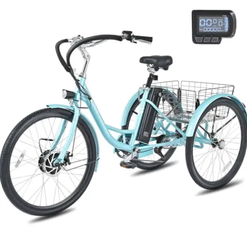 Experience the ultimate in convenience and style with the VIRIBUS 26″ Electric Tricycle for Adults in Aqua. This electric trike by Viribus features a powerful 350W motor and a UL certified 36V 13Ah battery, offering a range of 31 miles on a single charge. With 7-speed Shimano derailleur, riders can reach speeds of up to 15.5 mph with full throttle control. The trike’s comfortable design includes 1.95-inch tires, double-layer aluminum alloy hubs, and a spring suspension saddle for a smooth ride over any terrain. Plus, the spacious rear basket can carry up to 110 lbs, perfect for pets or groceries. Choose from 3 riding modes and 5 assistance levels for a customized journey every time. Get ready to explore in style and comfort with this versatile electric tricycle.