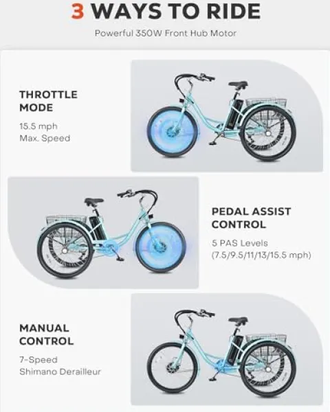 - 7-Speed Shimano Derailleur: Designed for beginner-friendly, safe, and effortless riding, our electric trike boasts a powerful 350W front hub motor paired with a 7-speed Shimano derailleur, reaching a maximum speed of 15.5 mph with full throttle control.