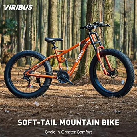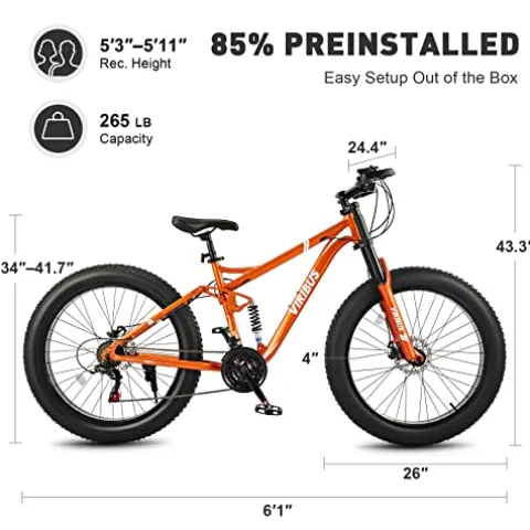 Conquer any terrain with the Viribus Fat Tire Mountain Bike. Crafted with a durable aluminum alloy frame, this adult mountain bike offers a smooth ride with its full suspension system that absorbs impact on rough trails. With 21 speeds controlled by micro-grip thumb shifters, you can easily tackle both flat stretches and steep inclines. Designed for comfort and versatility, this bike accommodates riders from 5’3″ to 5’11” and comes with adjustable features like the wide seat and handlebars with bar ends for added leverage. Plus, the included cycling gloves, bell, and waterproof headlight ensure you’re ready for any adventure. Enjoy the convenience of easy setup with 85% preinstalled parts and hit the trails in style with this sleek orange-colored Viribus mountain bike.