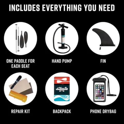 - 1 seat for each passenger 1 padded ankle brace strap for each passenger to get more leverage when rowing and more balance when standing. 1 cup holder for each passenger 1 double-paddle for each passenger 1 cell phone dry bag for each passenger 1 detachable fin. 1 Large Backpack Bag that zips up easily and is able to carry everything in it. All kayak bags will have durable luggage wheels to pull the bag around with.