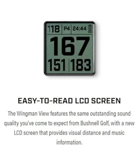 - EASY-TO-READ LCD SCREEN: The Wingman View features the same outstanding sound quality you’ve come to expect from Bushnell Golf, with a new LCD screen that provides visual distance and music information. Also get up to 6 audible and viewable hazard distances per hole on the Wingman View with the LCD screen.