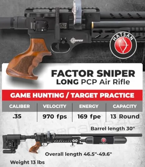 - In The Box: 1x Hatsan Factor Sniper Long .35 Caliber PCP Side-Lever Air Rifle; 1x Pack of Air Rifle Pellets; 1x Pack of Targets