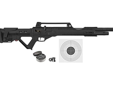 The Wearable4U Hatsan Invader Auto .22 Cal Air Rifle bundle offers everything you need for an exceptional shooting experience, including 100 paper targets and 250 .22 cal pellets. This tactical semi-automatic PCP air rifle features onboard magazine storage, a removable carry handle with adjustable sights, and Picatinny scope and accessory rails for versatility. The fully shrouded, precision rifled barrel ensures outstanding accuracy, while the advanced polymer stock provides a comfortable grip with an adjustable cheekpiece and soft rubber butt pad. With a maximum velocity of 1,000 FPS and the capability to deliver 50 shots at optimal velocity, this air rifle is perfect for both seasoned shooters and beginners looking to enhance their skills.