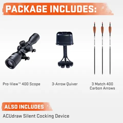 - WHAT’S INCLUDED – This bow comes with a Pro-View 400 Scope, the ACUdraw Silent Cocking Device, three Match 400 Carbon Arrows, an integrated string dampening system, a bow hook, and a quiver.