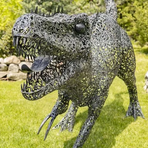 - They may be extinct but they’ll never be forgotten. Show-off this season and be the talk of the town with “Chompers” , our GIANT Metal Tyrannosaurus Rex Garden Statue. This beautifully constructed statue features an ornate iron crafted frame and a hand painted metallic black-bronze finish. He is freestanding but comes with metal stakes for added stability, especially one windy days. He makes a huge impact when displayed in front of your business, attracting potential customers with his attention grabbing size and beauty, and is a great addition to events, openings and photo-ops.
